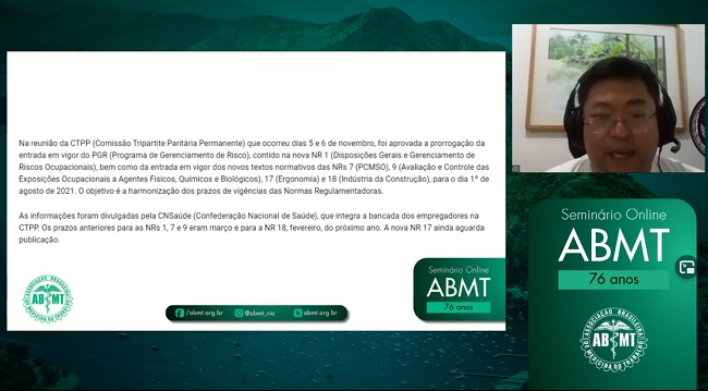Tradicionalmente, a Associação Brasileira de Medicina do Trabalho (ABMT) realiza um seminário no final do ano para celebrar o aniversário da entidade. Neste ano, em decorrência da pandemia de Covid-19, o formato foi adaptado para mídias atuais para que a tradição fosse mantida. Na última quinta-feira, dia 17 de dezembro, foi realizado o Seminário Online ABMT 76 Anos, transmitido gratuitamente pelo Facebook da Associação.