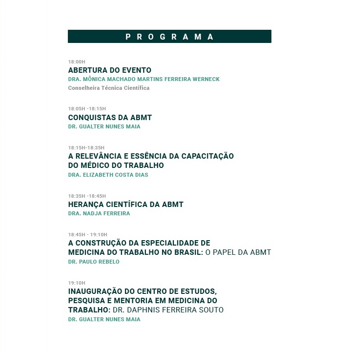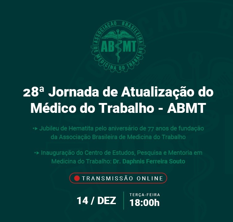 Na próxima terça-feira, 14 de dezembro, às 18h, a ABMT realizará a 28ª Jornada de Atualização do Médico do Trabalho, evento que reunirá palestras sobre a importância da especialidade e da capacitação do médico do trabalho, assim como da história da ABMT, que completa 77 anos em 2021 (Jubileu de Hematita).