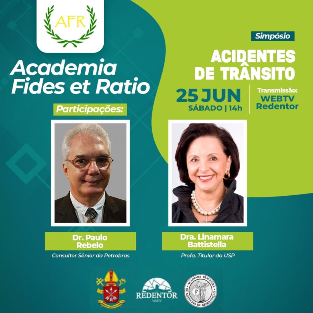 A Academia Fides et Ratio (AFR) realiza neste sábado (25), às 14h, um simpósio sobre Acidentes de Trânsito com a participação do conselheiro Técnico Científico da ABMT, Dr. Paulo Rebelo, e Dra. Linamara Battistella, professora Titular da USP. O evento será transmitido nas páginas do Facebook e YouTube da Web TV Redentor.