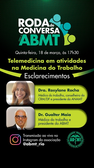 Amanhã, às 17h30, a Roda de Conversa com a ABMT recebe a presidente da ANAMT, Dra. Rosylane Rocha, para uma conversa ao vivo, trazendo esclarecimentos sobre o uso da telemedicina e as possibilidades de aplicação e seus impeditivos na especialidade de Medicina do Trabalho, que prima pela ética e fundamentação técnico científico. A mediação será do presidente da ABMT, Dr. Gualter Maia.