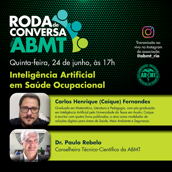 No dia 24 de junho, às 17h, a Roda de Conversa com a ABMT recebe Carlos Henrique Fernandes, modelador de soluções digitais para áreas de Saúde, Meio Ambiente e Segurança, para uma conversa sobre Inteligência Artificial em Saúde Ocupacional. O Conselheiro Técnico-Científico da ABMT, Dr. Paulo Rebelo, mediará a live.